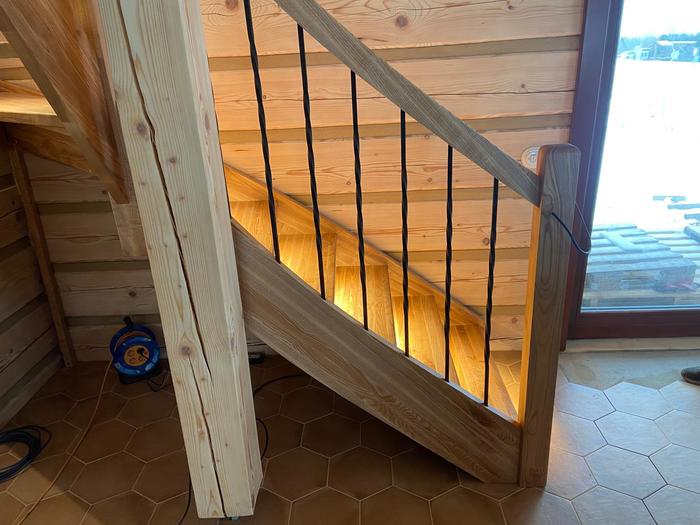 Na zábradlí schodiště a galerie jsme použili dřevěné sloupky a madlo a k nim kované tyčky, které dodávají schodišti tradiční a stylový vzhled, jenž koresponduje s charakterem roubenky. Celou konstrukci schodiště jsme doplnili o teplé LED osvětlení, které je zabudováno pod jednotlivými nášlapy jednotlivých schodů. Toto osvětlení nejenže zvyšuje bezpečnost při pohybu po schodech, ale také vytváří příjemnou a útulnou atmosféru v interiéru.