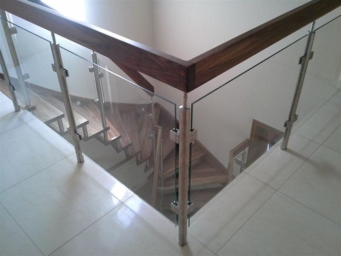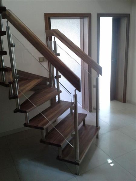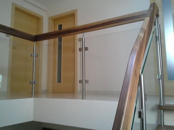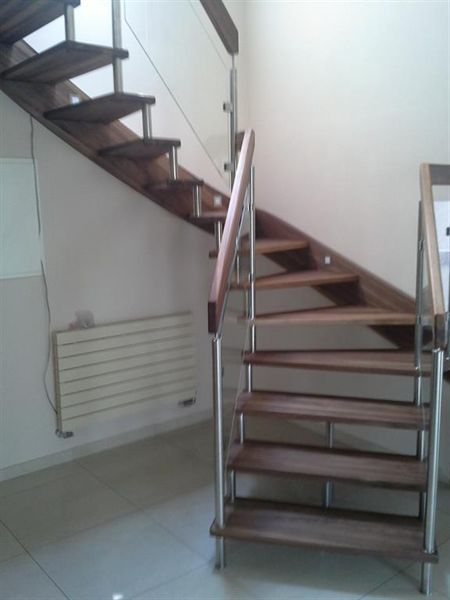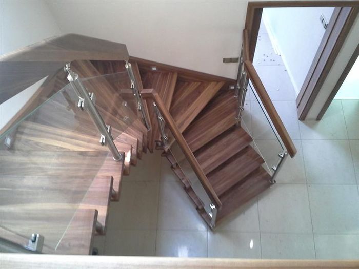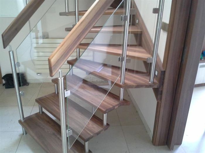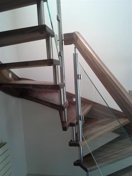 Ukončili jsme montáž samonosných dřevěných schodů ve tvaru L u kterých bylo použito skleněné zábradlí s dřevěným madlem. Dřevěné části schodů jsou vyrobeny z masivu ořech.