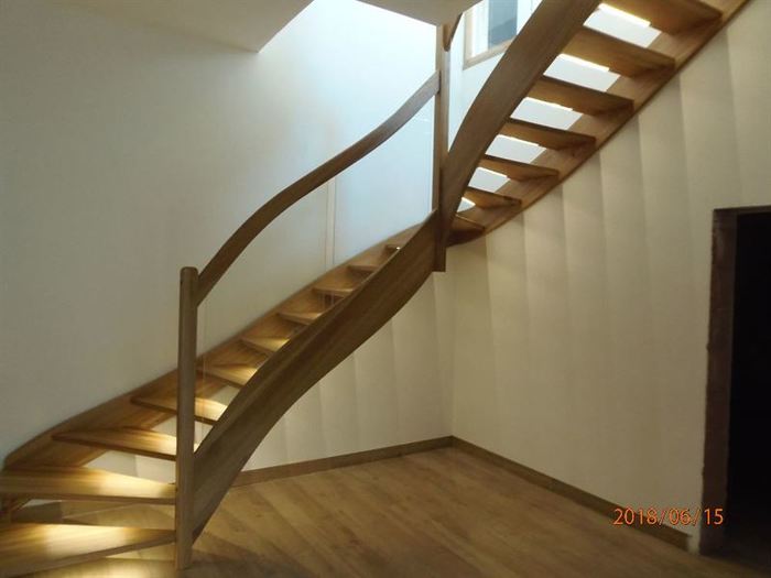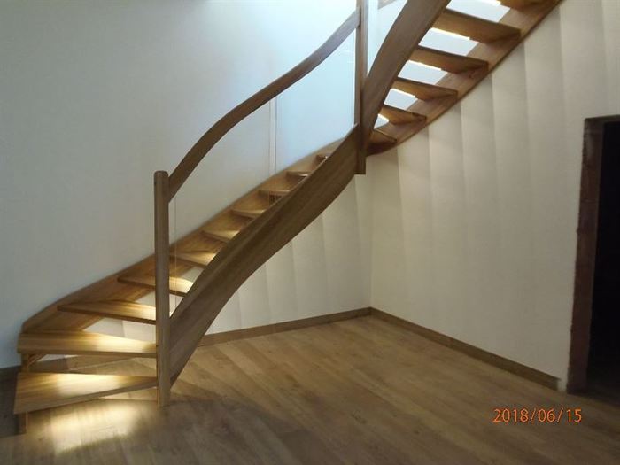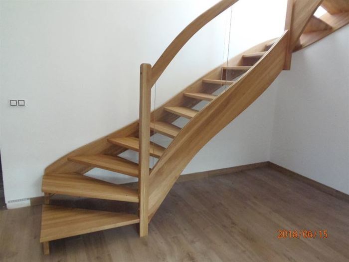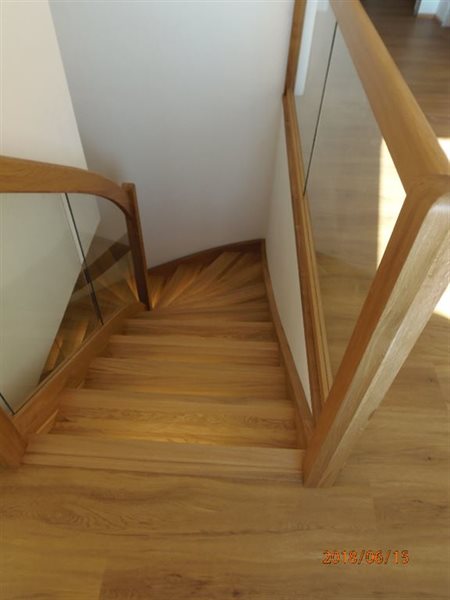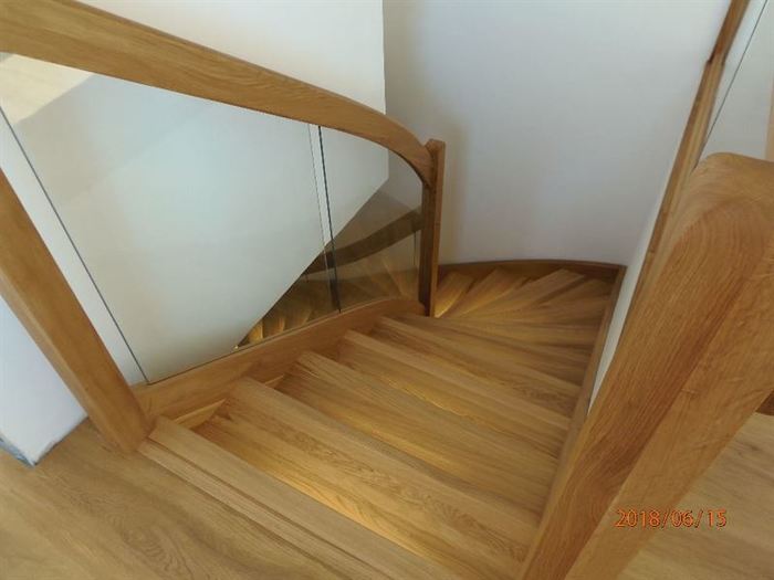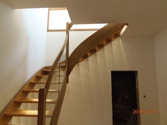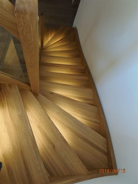 Po montáži jsme předali zákazníkovi nedaleko Třebíče dřevěné, samonosné, osvětlené schodiště se skleněným zábradlím. Schodiště je vyrobeno z masivu dubu průběžného s povrchovou úpravou olejováním.
