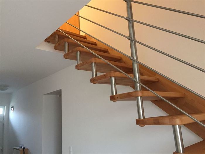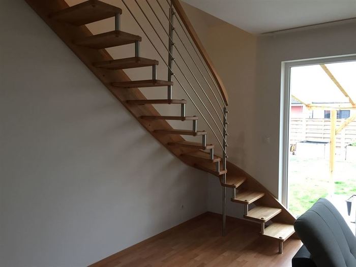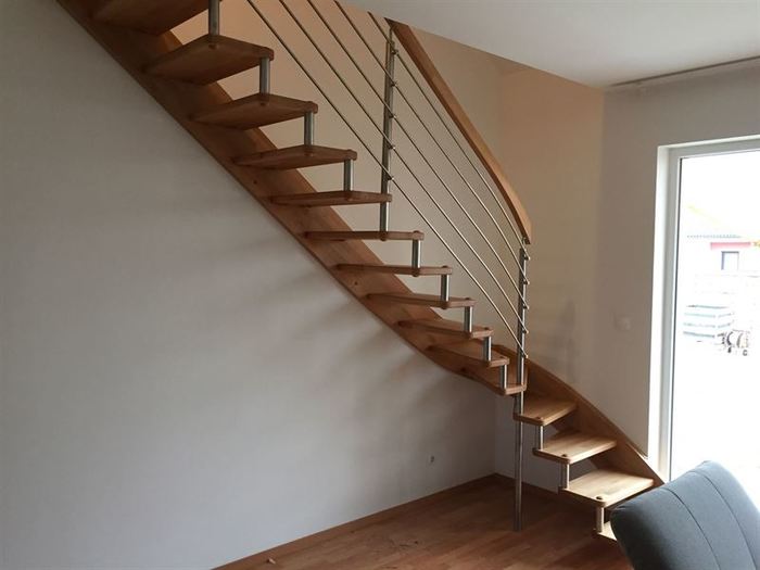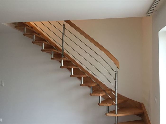Toto schodiště je samonosné ve tvaru písmene L a součástí schodiště je i distanciery s vodorovným nerezovým zábradlím. Nerezové zábradlí distanciéry i u schodiště má nerezové vodorovné prvky a dřevěné madlo vyrobené ze stejného materiálu jako celé schodiště.