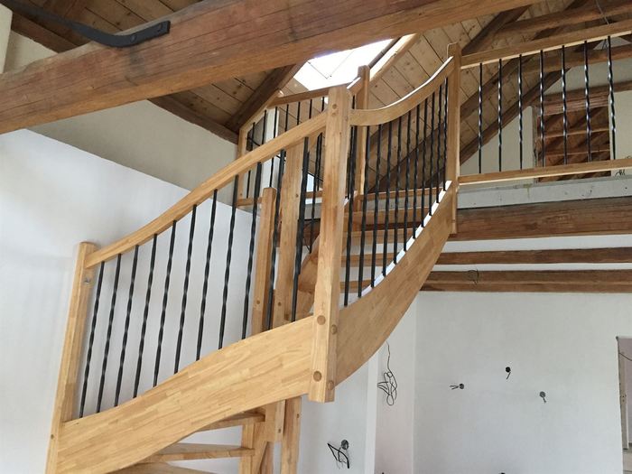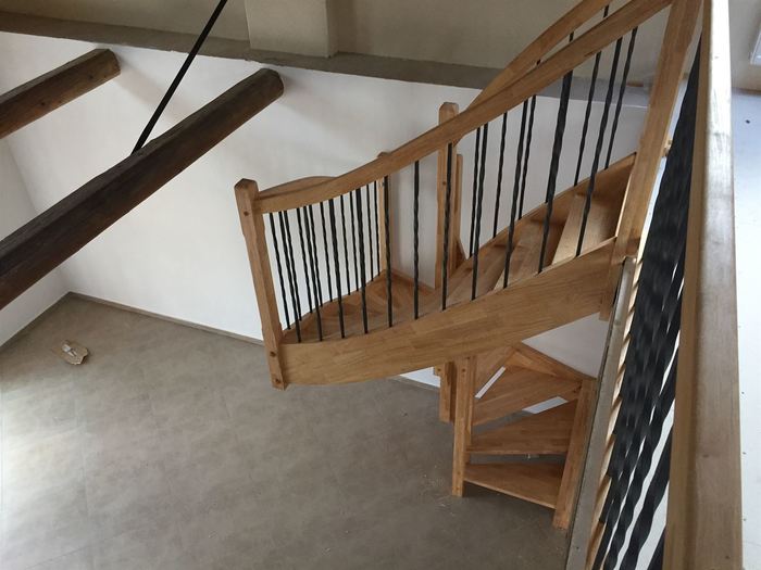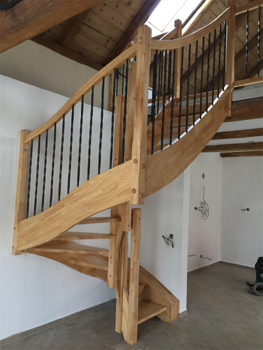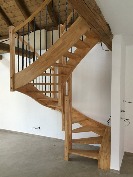 Pro zákazníka z Kutné Hory jsme vyrobili samonosné schodiště do „U“ z exotického tropického dřeva hevey. Schodiště bylo bez dřevěných podstupňů, zábradlí schodiště bylo kombinované - dřevěné sloupky a kovové tyčky. Madlo zábradlí schodiště bylo také z masivu hevey. Všechny dřevěné části schodiště / nášlapy, sloupky, bočnice / mají provedenou povrchovou úpravu olejováním. Olejování jednak zvýší životnost a odolnost dřevěných částí schodiště, ale také zvýrazní kresbu dřeva a je schopné ovlivnit i odstín dřeva.