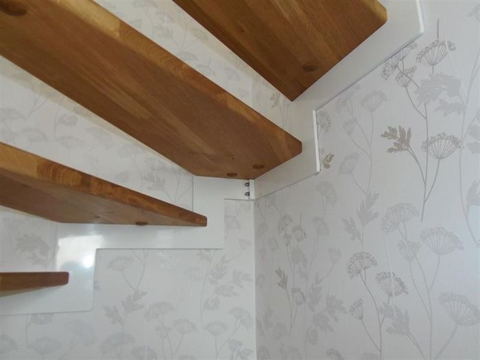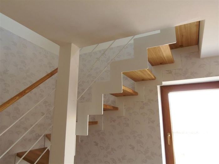 Vyrobili jsme a namontovali schody s bílou železnou bočnicí a dřevěnými nášlapy z masivu materiálu dub průběžný.
