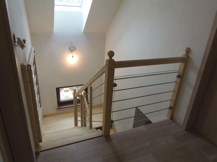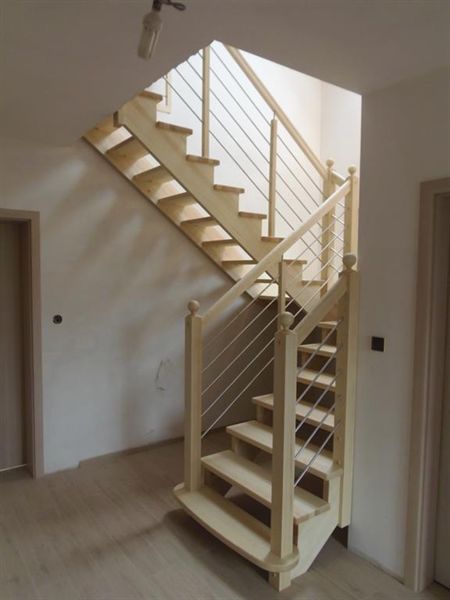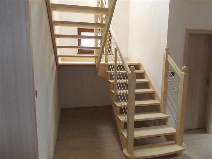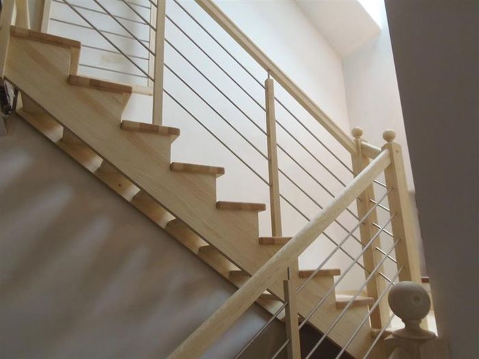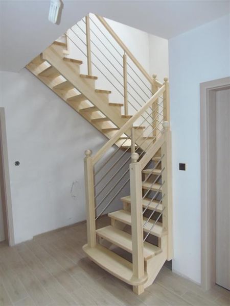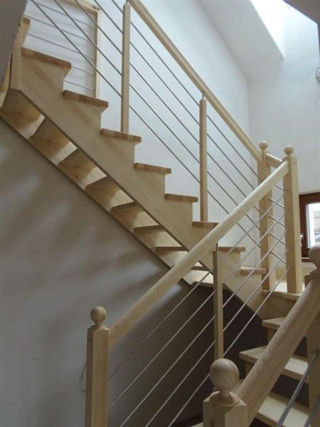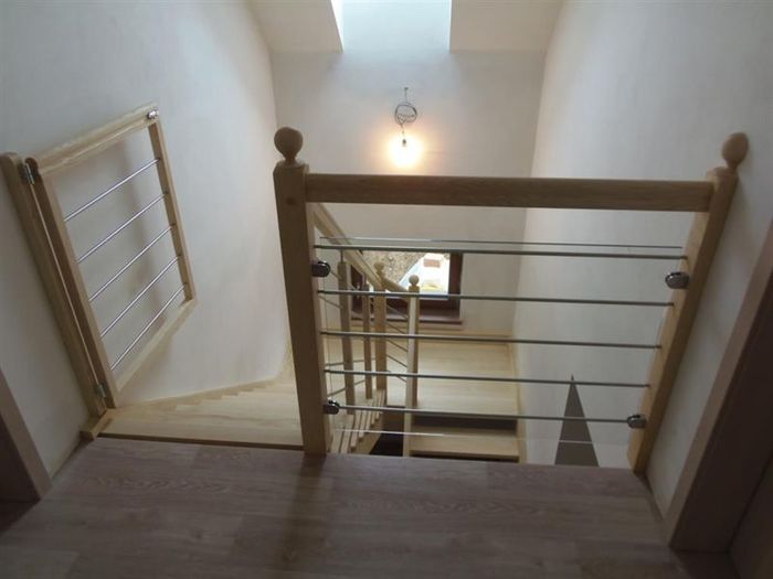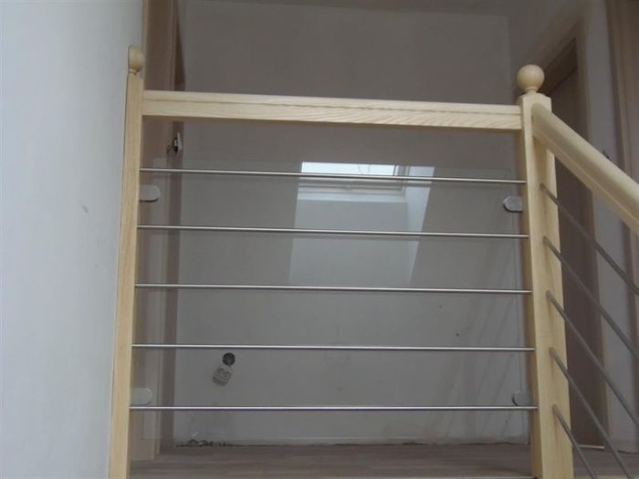 Součástí schodiště je kombinované zábradlí které tvoří dřevěné sloupky a madlo zábradlí a nerezové kulaté pruty. Schodiště je v horní části zakončeno zábradlím a brankou na podestě schodiště. Tím je zajištěna bezpečnost dětí pohybujících se po horním patře domu.