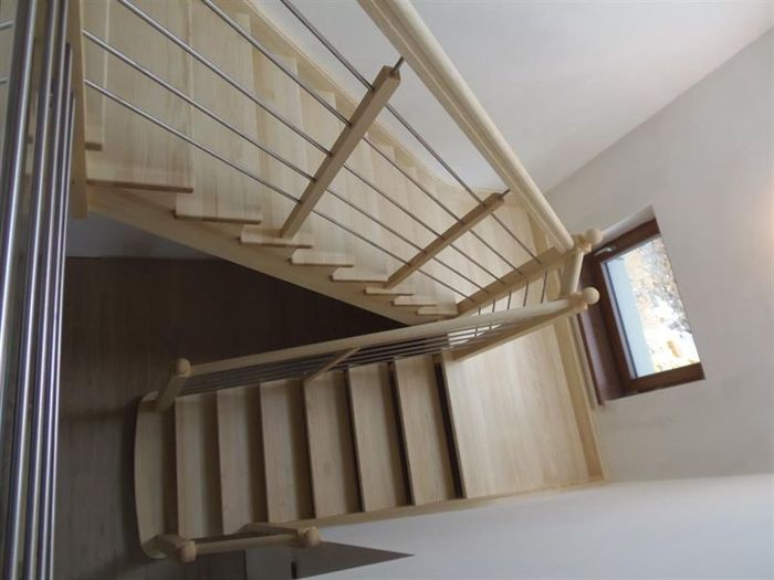 Z běleného jasanu s povrchovou úpravou olejováním jsme vyrobili krásné dřevěné schodiště v kombinaci s nerezovými pruty které jsou součástí zábradlí z dřevěných sloupků a madla také z olejovaného běleného jasanu.