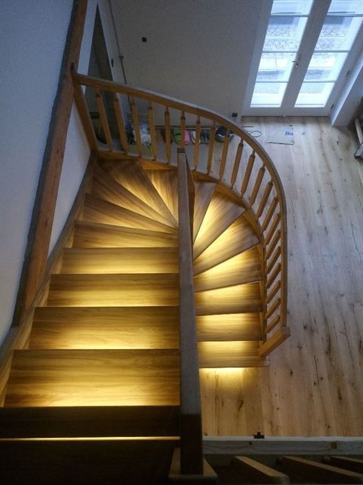 Jde o samonosné dřevěné schodiště do rodinného domu v Praze. Schodiště má ohýbanou vnější bočnicí a zábradlí které pokračuje i na dlouhou balustrádu u schodiště. Jednotlivé nášlapy schodiště jsou osvětleny, což dodává schodišti zajímavý efekt a díky osvětlení se stává schodiště dominantou interiéru místností v domě.