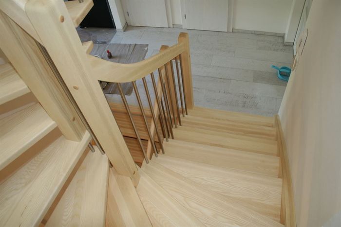 Montáž schodiště v Brně proběhla rychle a bez problémů. Přesně vyrobené díly vytvořili toto luxusní samonosné schodiště vyrobené ze dřeva jasanu. Povrchová úprava dřevěných částí schodiště byla provedena olejováním. Součástí výroby i montáže schodiště bylo dřevěné zábradlí po celé délce schodiště a také nad ním na distanciéry / volná část horního patra domu nad schodištěm. Po montáži jsme schodiště předali majiteli domu v Brně bez problémů .