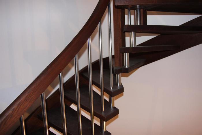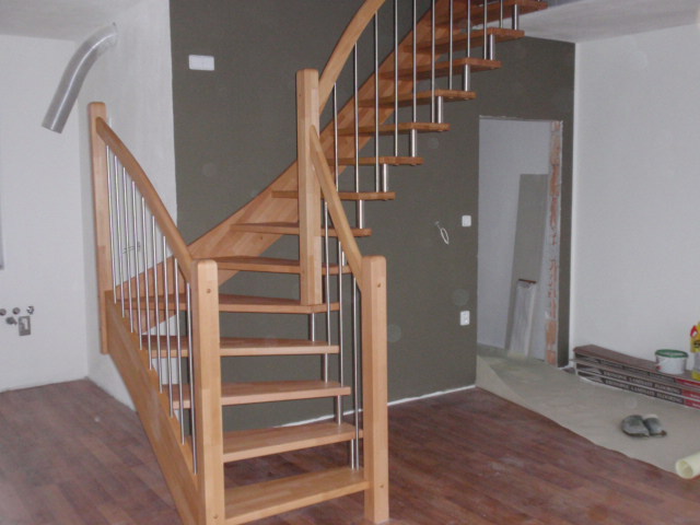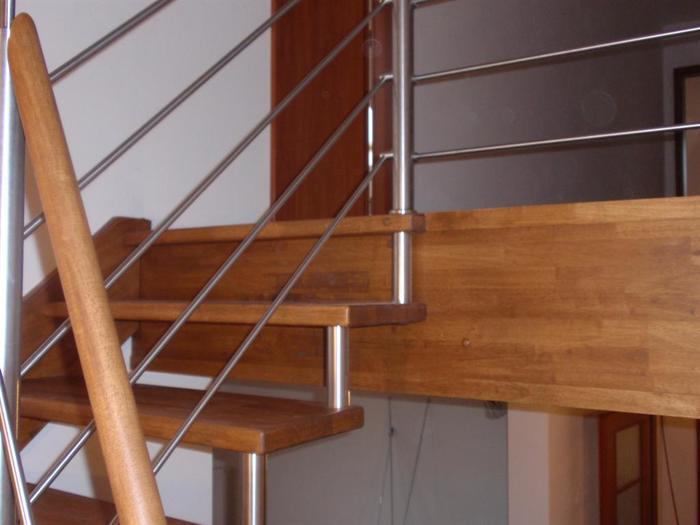 Třetí variantou je výroba dřevěného schodiště bez vnitřní bočnice, která je nahrazena nerezovými válečky / distanciery / mezi jednotlivými nášlapy. Válečky jednak spojují celé schodiště na vnitřní straně schodiště, ale také svojí délkou určují výšku jednotlivých schodů na schodišti.