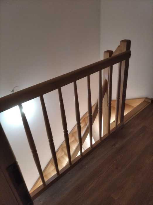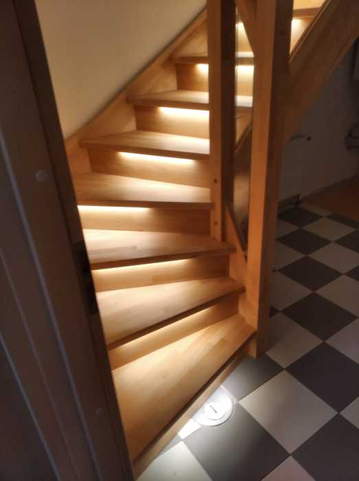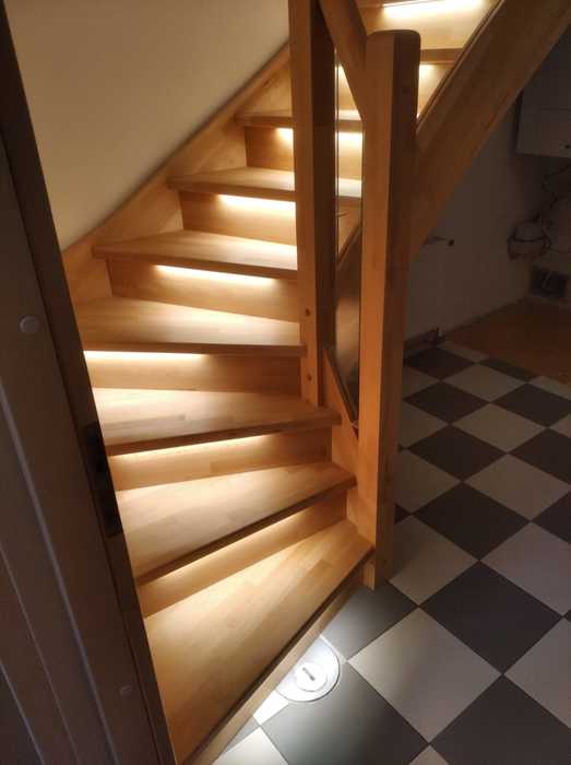 Součástí výroby tohoto dřevěného schodiště byla také montáž teplého bílého osvětlení pod každým jednotlivým nášlapem schodiště. Osvětlení je v poslední době relativně častou součástí výroby dřevěných schodišť, které vyrábíme pro naše zákazníky.