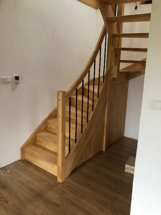Manželé Novákovi se rozhodli rekonstruovat starší dům a původní betonové schodiště vyměnit za samonosné dřevěné. Vybrali variantu ze světlého dubu, která krásně propojila přízemí s patrem a opticky zvětšila celý obývací prostor. Pod schody si nechali vyrobit na míru otevřené police na knihy a uzavíratelné skříňky na hračky pro děti. „Je to nejlepší rozhodnutí, které jsme při rekonstrukci udělali. První, čeho si všimne každá návštěva, je právě naše schodiště,“ pochvaluje si paní Nováková.