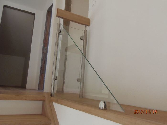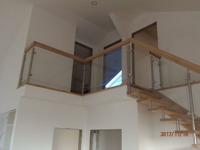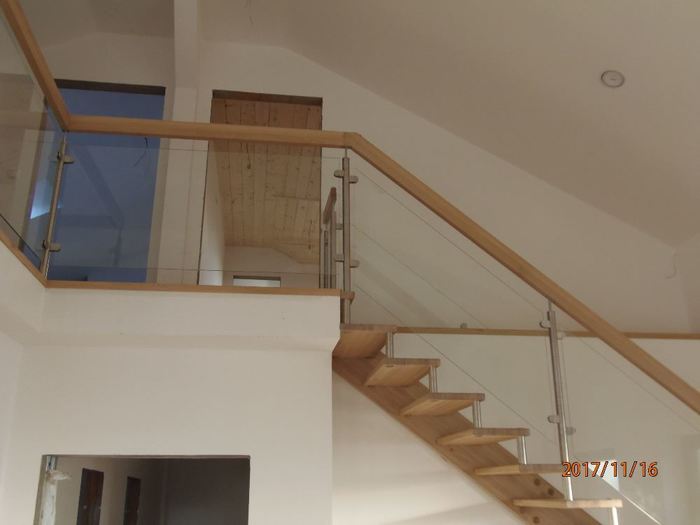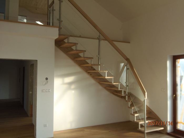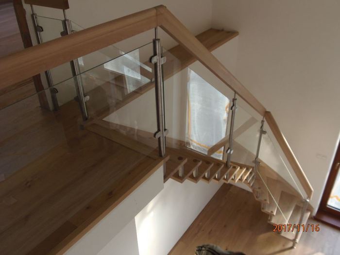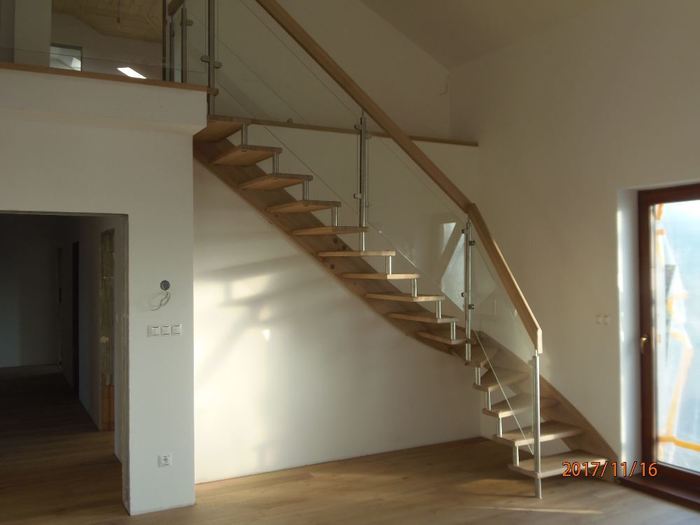 Toto atypické a luxusní schodiště je vyrobeno ze dřeva, masivu dubu průběžného s povrchovou úpravou olejováním, nerezových distancier, nerezových sloupků zábradlí s vyplní zábradlí z tvrzeného bezpečnostního skla. Zábradlí tohoto samonosného dřevěného schodiště pokračuje v patře nad schodištěm podél galerie. Schodiště je ve tvaru písmene „L“ a montáž jsme provedli v rodinném domě u Třebíče.