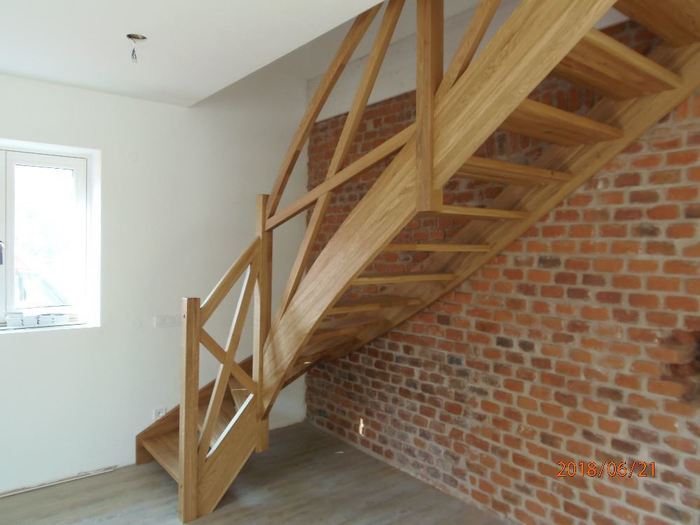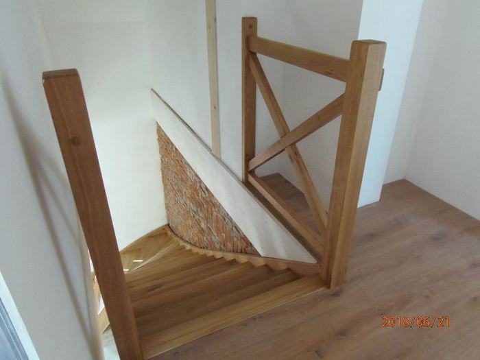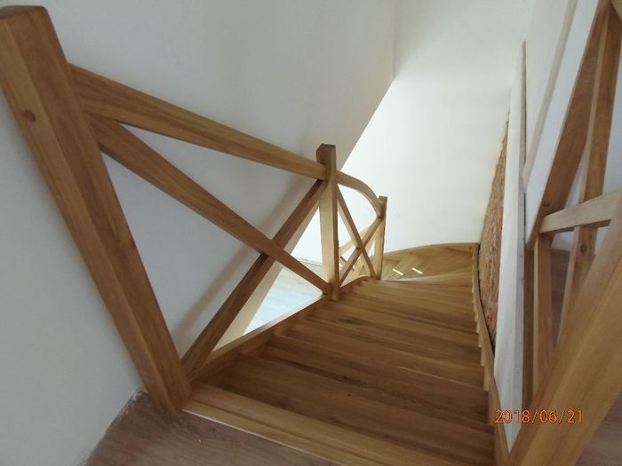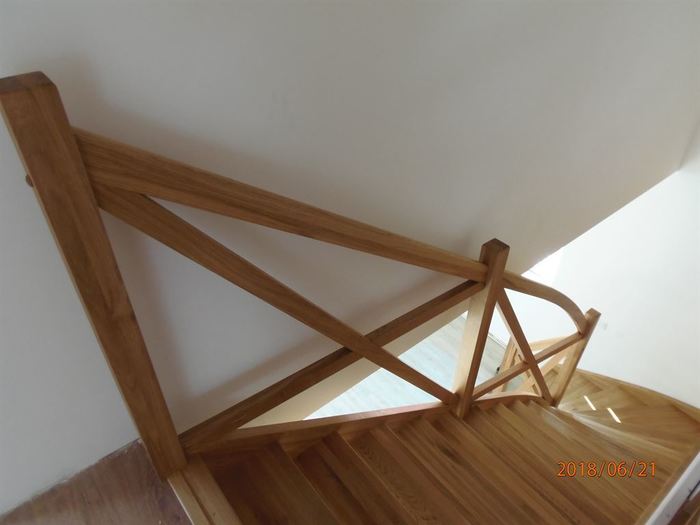 Dřevěné schodiště ve tvaru písmene „L“ s atypickým zábradlím v selském stylu. Schody jsou bez podstupňů a jsou vyrobené z dřeva dubu průběžného. Ze stejného materiálu, dřeva dubu průběžného je vyrobené i atypické dřevěné zábradlí schodiště v selským stylu. Povrchová úprava dřeva byla provedena technologií olejováním, které zvýrazní kresbu dřeva.