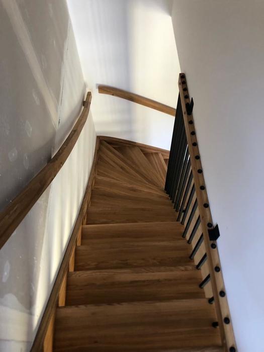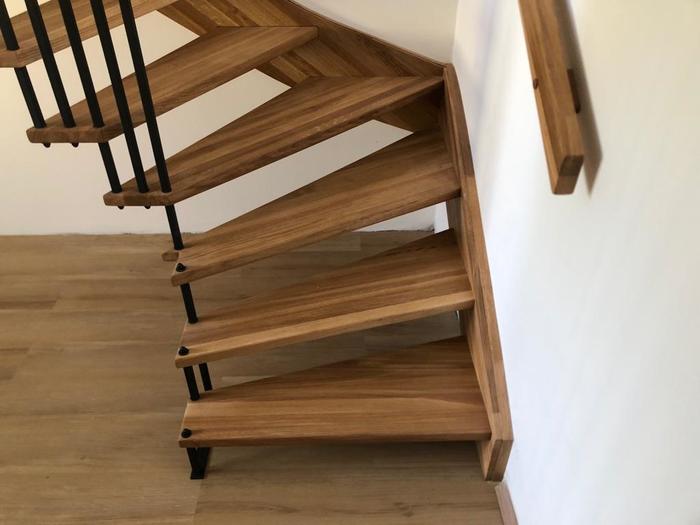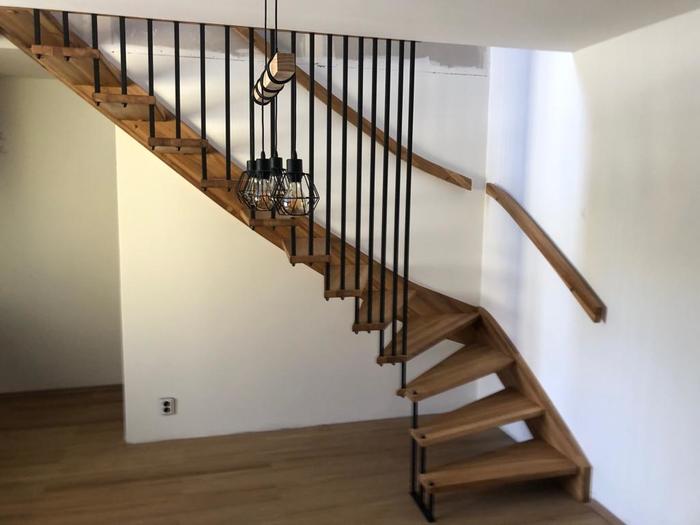 Do rodinného domu v okrese Brno venkov jsme zákazníkovi namontovali dřevěné samonosné schodiště ve tvaru „L“ se zábradlím s hranatými železnými tyčkami v černé barvě na vnitřní straně schodiště a madlem na vnější stěně schodiště z olejovaného průběžného dubu ze kterého je vyrobeno i celé schodiště.
