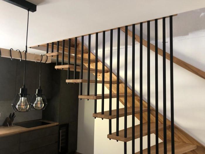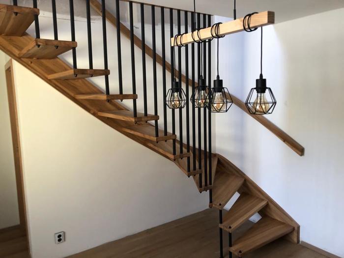 Dřevěné samonosné schodiště s železnými tyčkami v zábradlí