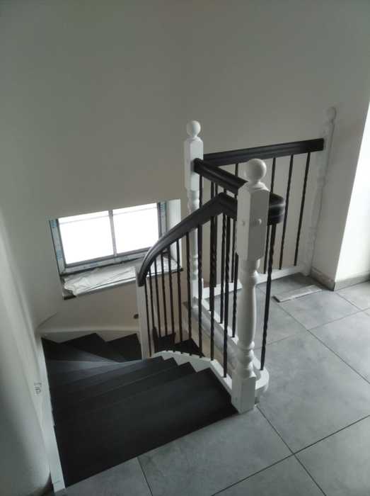 Ve Znojmě jsme namontovali do rodinného domu dřevěné samonosné schodiště z masivu dub cink s povrchovou úpravou nášlapů a podstupňů mořením do černa s následným olejováním. V zábradlí u schodiště a na galerii jsme použili kované tyčky a vyřezávané sloupky a madlo také ze dřeva dubu cink s povrchovou úpravou nástřikem bílou barvou RAL.