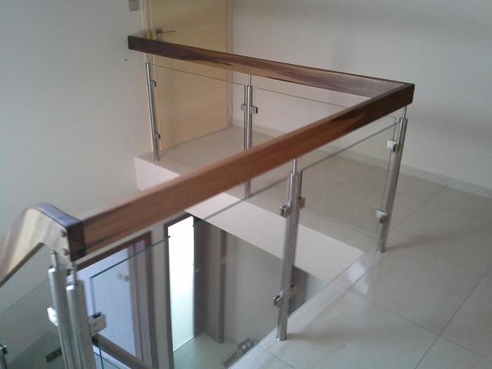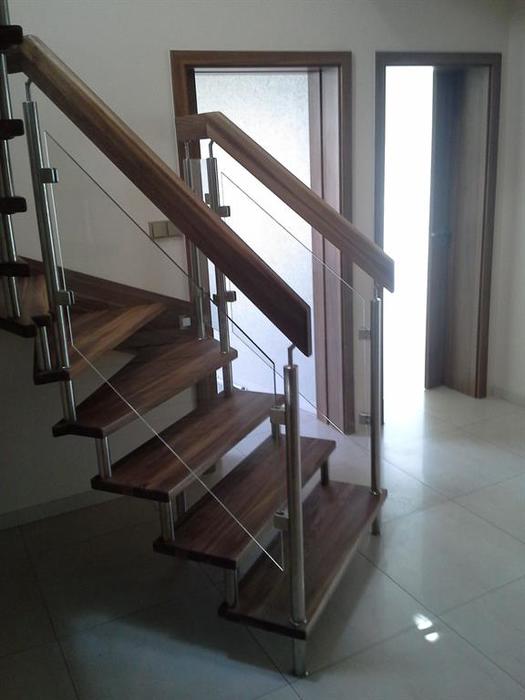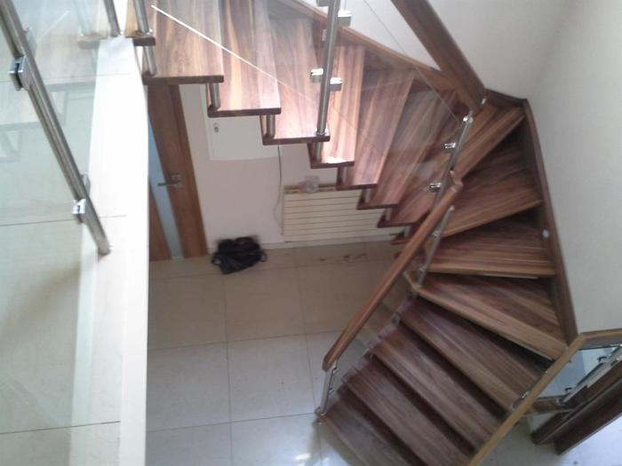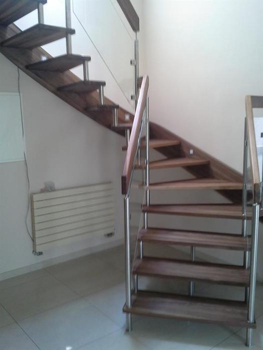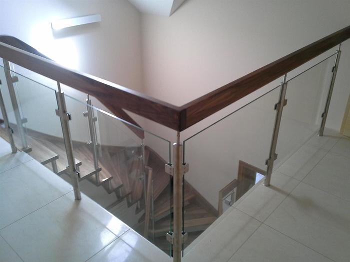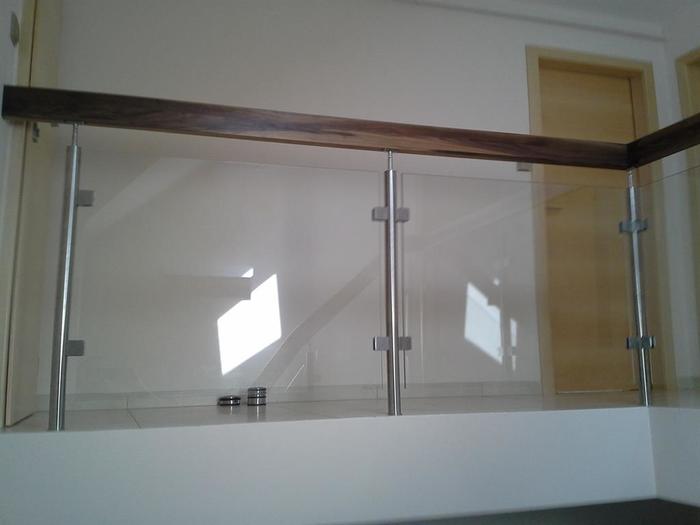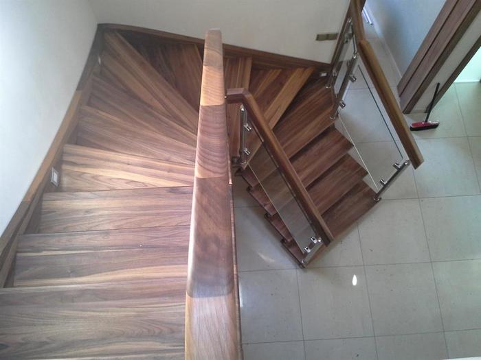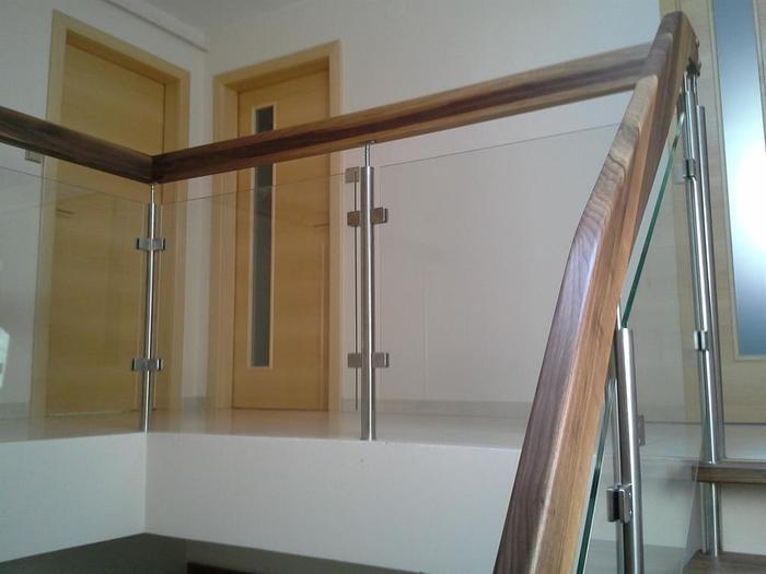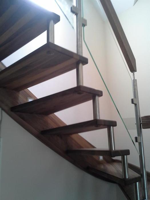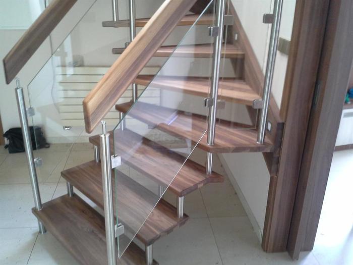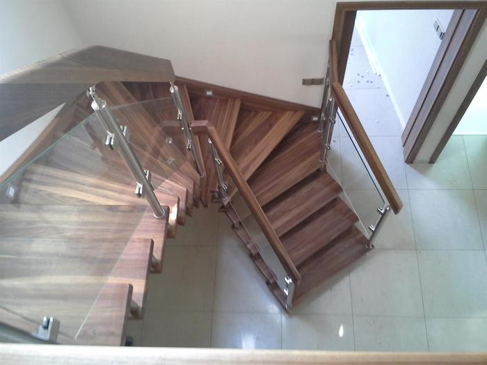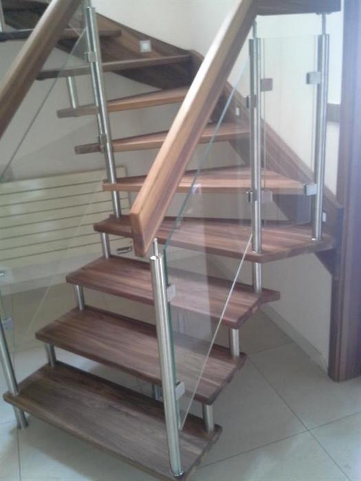 Dřevěné samonosné schodiště ve tvaru písmene „U“ z materiálu masiv ořech, distanciery, skleněné zábradlí s dřevěným madlem také z dřeva ořechu.