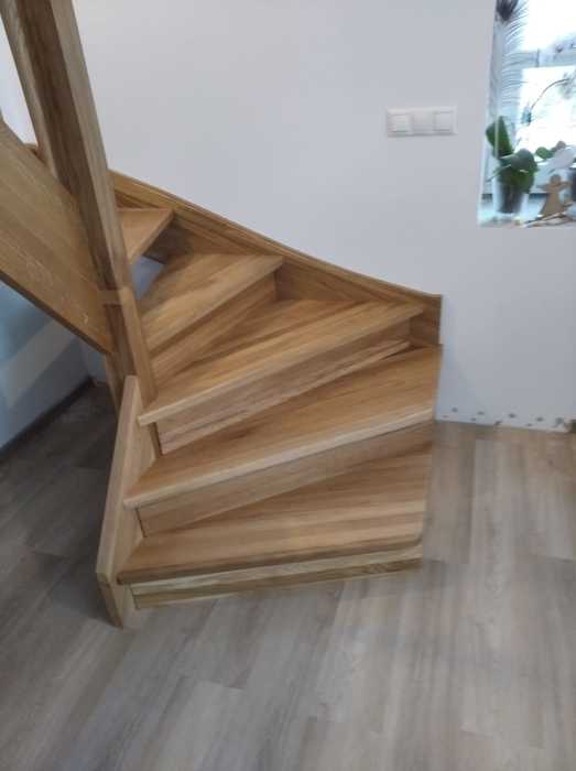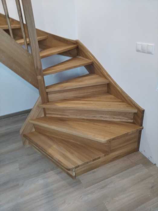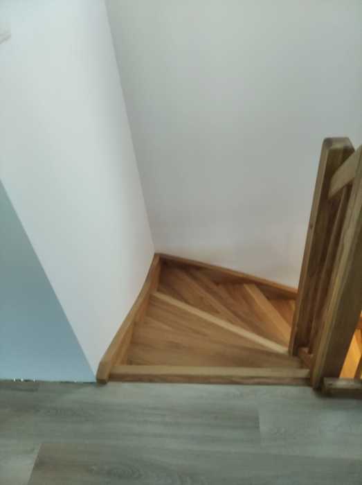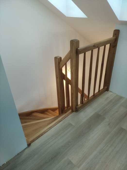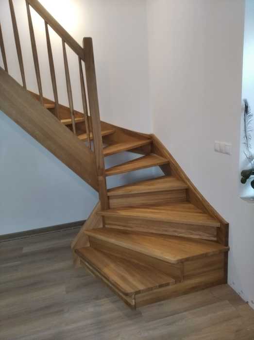 Toto dřevěné samonosné schodiště už by se dalo nazvat s mírnou dávkou nadsázky jako dřevěné točité schodiště protože 4 x mění směr, z toho 3 x podél stěn místnosti v rodinném domě, ve kterém je namontované, a jednou z prostoru a to ve spodním patře domu. Jako materiál na výrobu tohoto schodiště jsme použili po domluvě se zákazníkem dub průběžný s povrchovou úpravou olejováním.