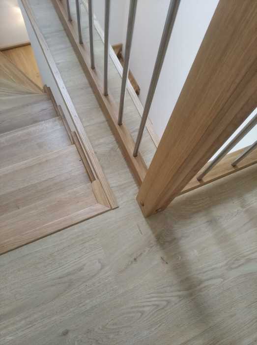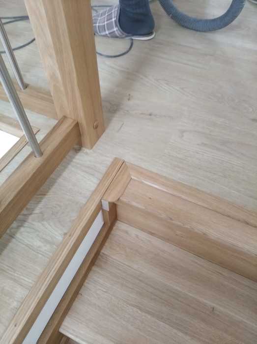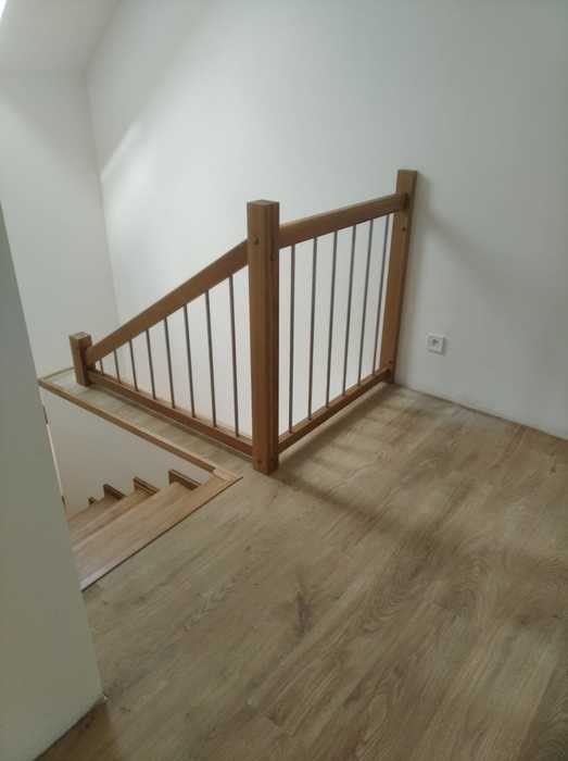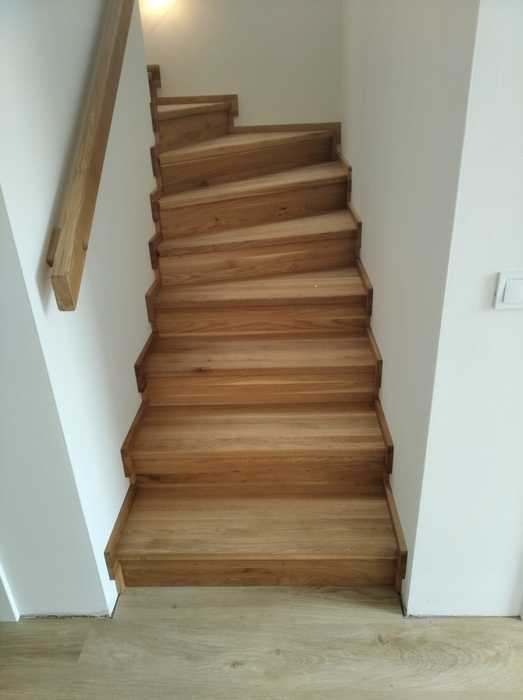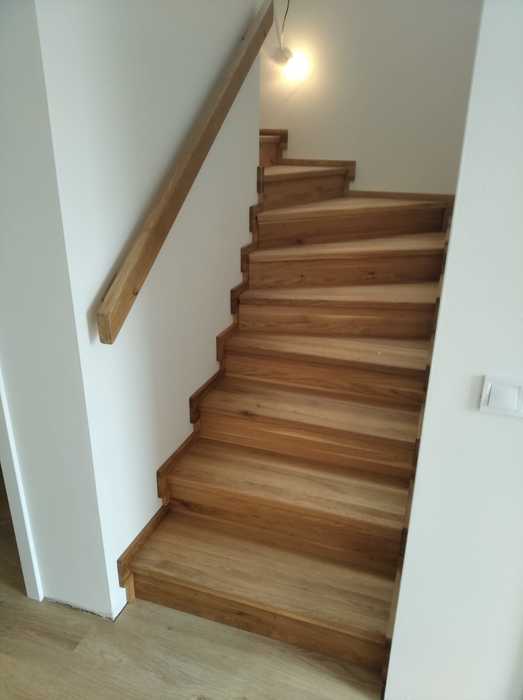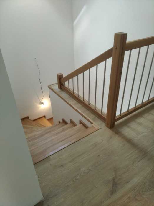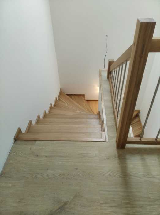 Schodiště jsme dle přání zákazníka vyrobili ze dřeva dubu průběžného s povrchovou úpravou, včetně madla na stěně a galerie v patře, olejováním.
