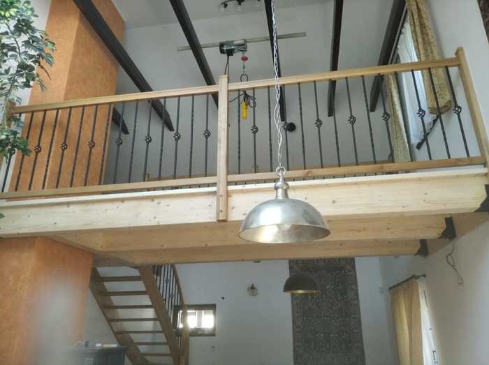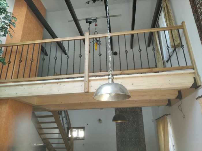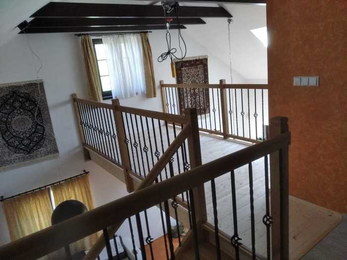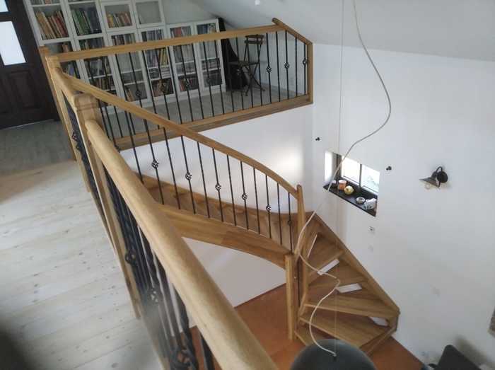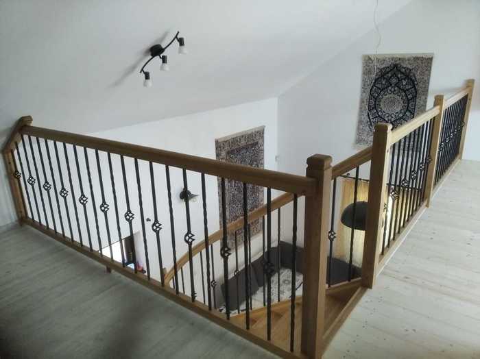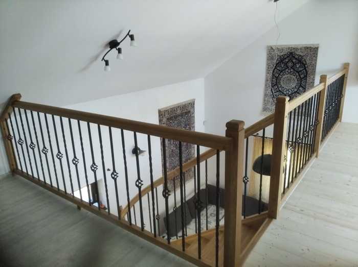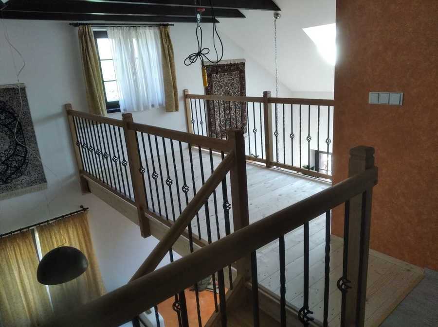 Součástí tohoto dřevěného schodiště je zábradlí s kovanými tyčkami, které dodávají celému prostoru jedinečný charakter. Kombinace přírodního dřeva a kovu spojuje tradiční řemeslo s moderním designem. Madlo zábradlí, vyrobené rovněž z dubu, zajišťuje pohodlné a bezpečné uchopení.