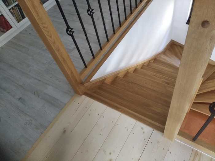 Kromě samonosného schodiště jsme pro zákazníka vyrobili a namontovali také podlahu na podestě schodiště, která je zhotovena z masivního smrku. Smrková podlaha přináší do celé realizace jemný kontrast a světlý nádech, který skvěle doplňuje tmavší odstíny dubového schodiště.