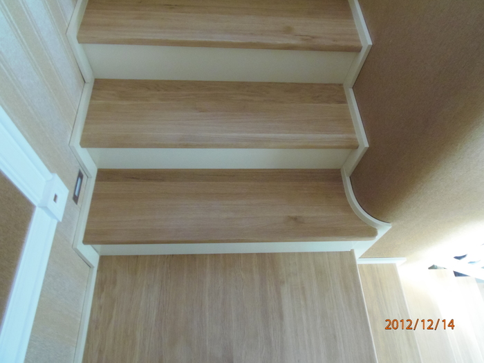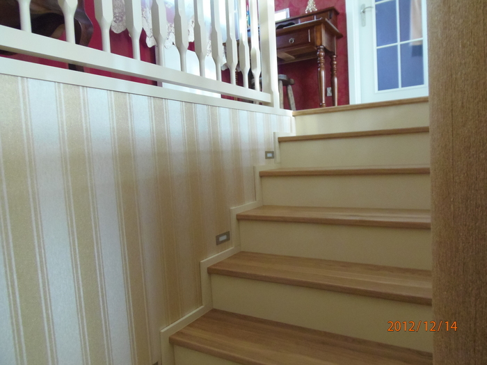 Celé obkladové schodiště včetně obložení, zábradlí i galerie je vyrobeno z masivu dubu průběžní s tím, že nášlapy schodů a madlo zábradlí jsou v přírodní barvě dřeva s lakováním a podstupně schodů, obložení stěny schodiště a zbylé části zábradlí jsou bílé, provedli jsme nástřik barvou na dřevo RAL.