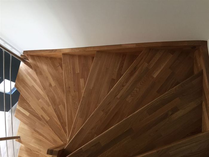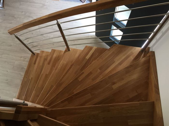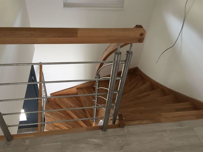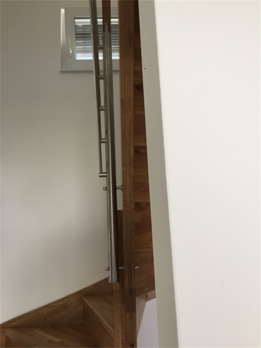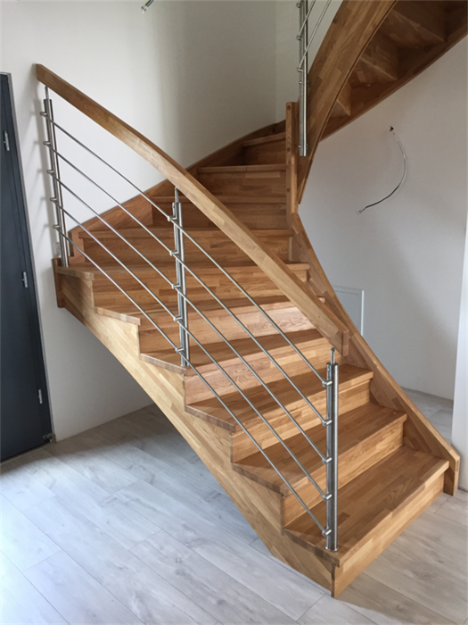 Schodiště je samonosné s podstupni a sedlovou bočnicí. Součástí schodiště je zábradlí a galerie z nerezu. Celá dřevěná část schodiště / nášlapy, podstupně i bočnice / je vyrobena z buku cinku. Pro zvýšení odolnosti proti poškožení , opotřebení a ke zvýraznění kresby na dřevě byla provedena povrchová úprava schodiště olejováním.