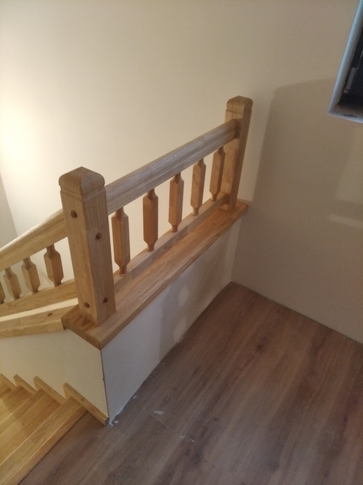 Schodiště má sedlové bočnice, dřevěné obklady stěn okolo schodiště, dřevěné zábradlí na galerii a zábradlí umístěné na středové zídce. Celé zábradlí u schodiště i galerie je dřevěné a vyrobeno ze stejného typu masivu včetně povrchové úpravy.