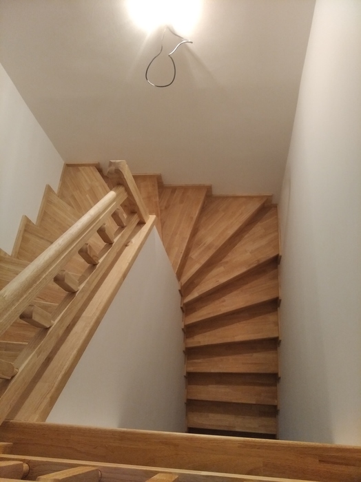 Toto samonosné dřevěné schodiště ve tvaru písmene U jsme vyrobili a namontovali zákazníkovi do rodinného domu nedaleko Prahy.