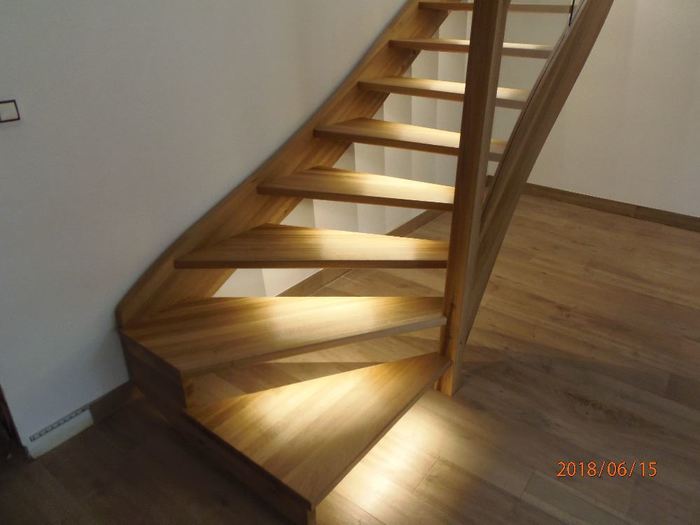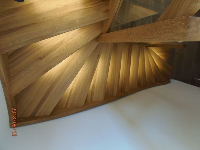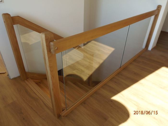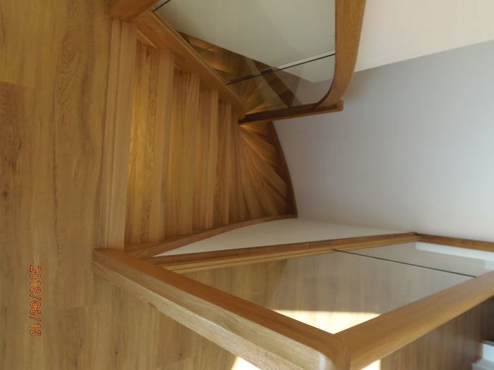 Samonosné dřevěné schodiště se skleněným zábradlím je vytobené z masivu dubu průběžného.Dřeva použité na schodišti bylo na povrchu ošetřeno olejováním, které zvýrazní krezbu dřeva a změní i částečně barvu Dřeva. Schodiště má zapojené pod jednotlivými nášlapy bílým teplým osvětlením. Toto samonosné schodiště má skleněné zábradlí, které pokračuje až na galerii navazující na schodiště v patře.