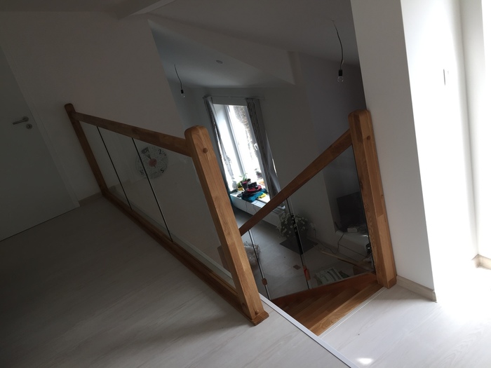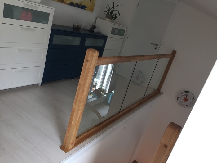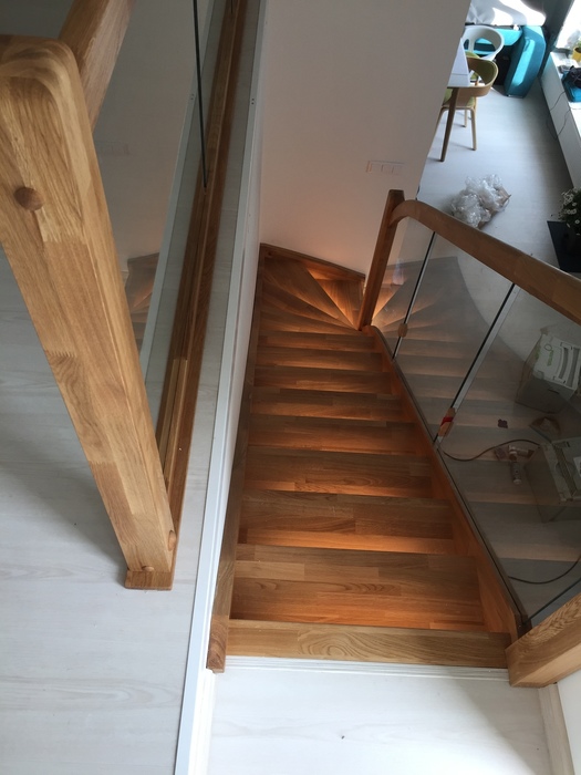 Samonosné dřevěnéschodiště do L s podstupni, se skleněným zábradlím mezi dřevěnými sloupky, skleněnou galerii a osvětlením - bílá teplá. Schodiště je vyrobeno z dubu cinku a olejováno. Montáž schodiště Praha.