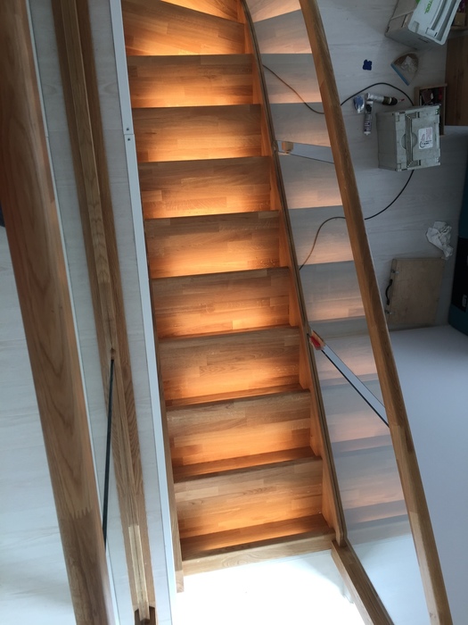 Samonosné dřevěvěné schodiště s osvětlením a skleněným zábradlím