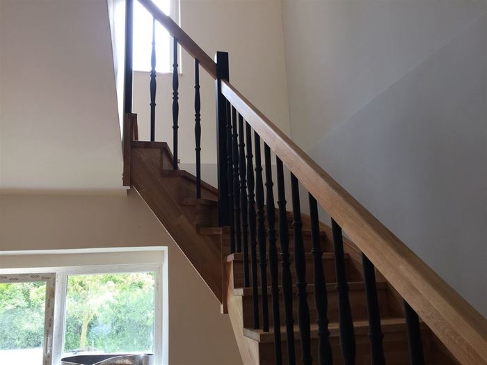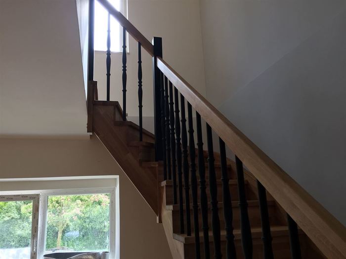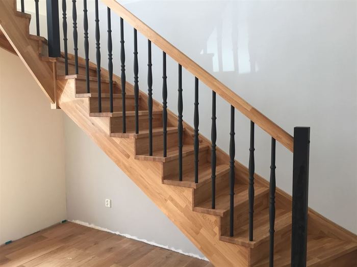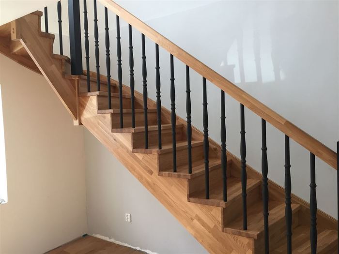 Bočnice, nášlapy a podstupně tohoto samonosného schodiště mají provedenou povrchovou úpravu olejem určeným na olejování dřeva. Sloupky a tyčky zábradlí k tomuto schodišti jsou lakované na černo. Madlo zábradlí je ze stejného materiálu jako nášlapy , podstupně a bočnice schodiště / dub cink/ a je také povrchově upravené olejováním.