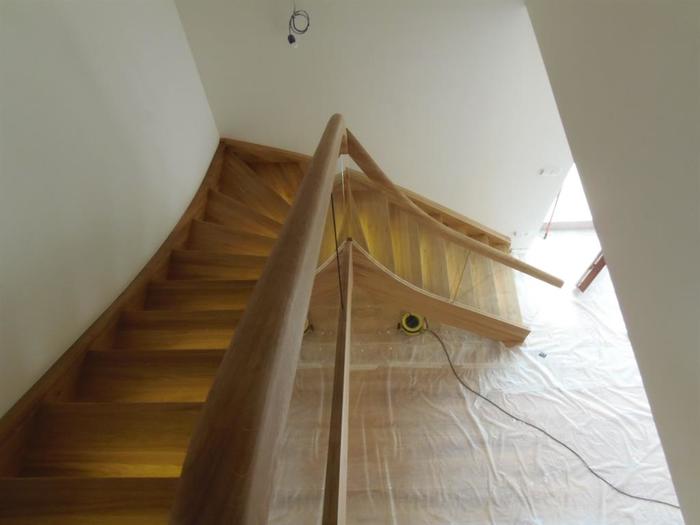 Samotné samonosné schody jsou ve tvaru L“ podél dvou stěn místnosti. Skleněné zábradlí s dřevěným madlem je pouze na vnitřní straně schodiště.