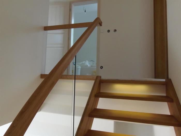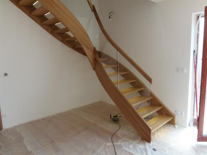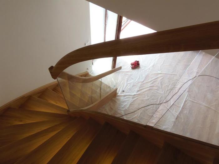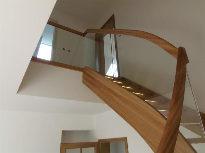 Samonosné schodiště jsme vyrobili a namontovali zákazníkovi z Prahy .Materiál na výrobu schodiště byl průběžný dub olejovaný. Součástí dodávky byla také montáž LED osvětlení schodiště a skleněné zábradlí s dřevěným madlem. Skleněné zábradlí s dřevěným madlem se montovalo také na galerii nad schody.