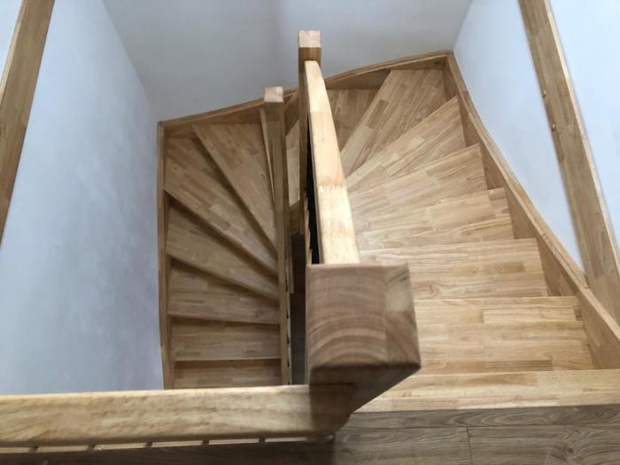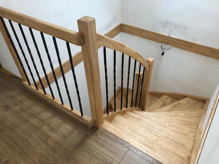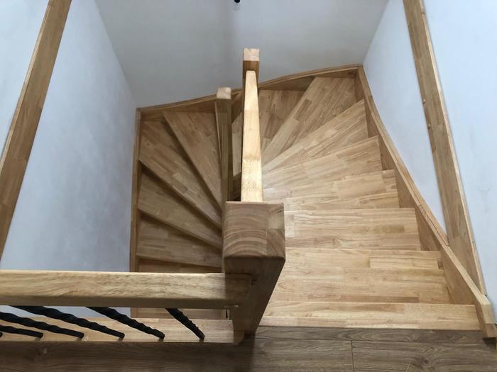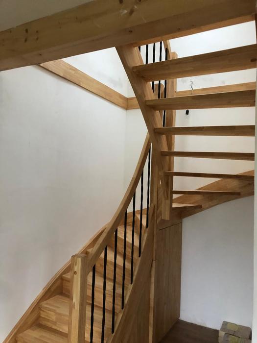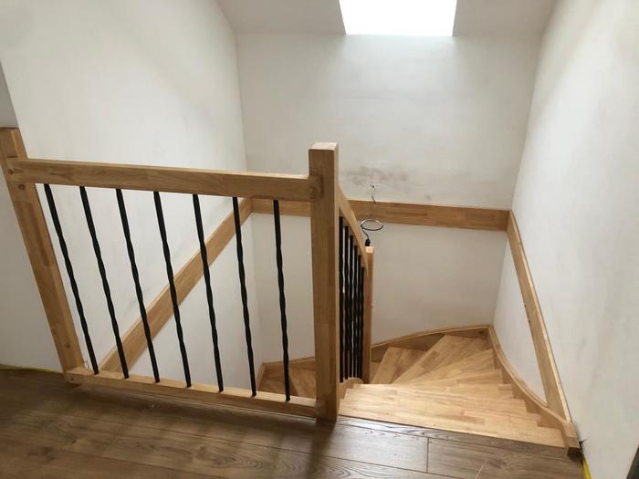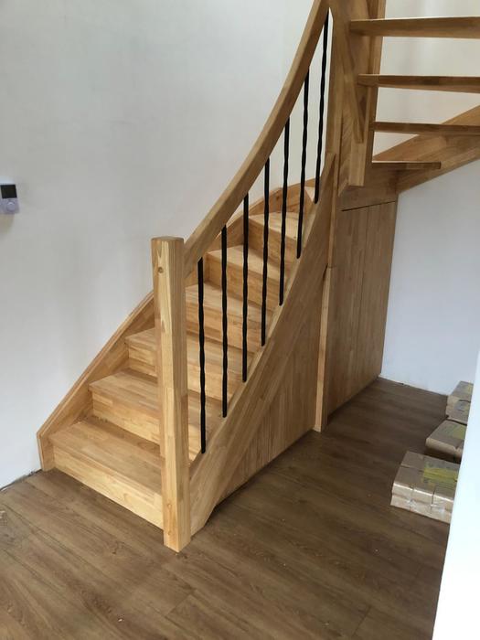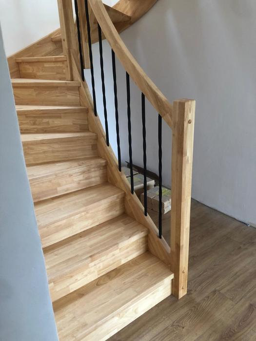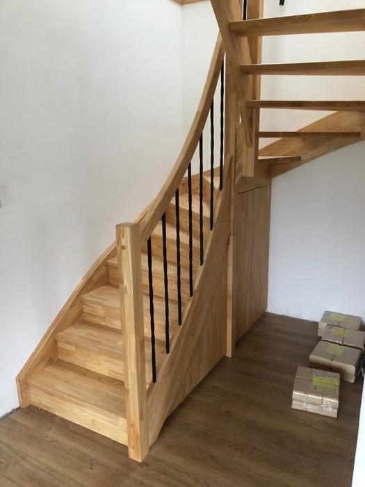Samonosné schodiště ve tvaru písmene „U“ s úložným prostorem, galerií v horním patře a bezpečnostními dvířky na začátku schodiště, ve spodním části jsme vyrobili ze dřeva hevey s povrchovou úpravou olejováním pro zákazníka nedaleko Liberce.