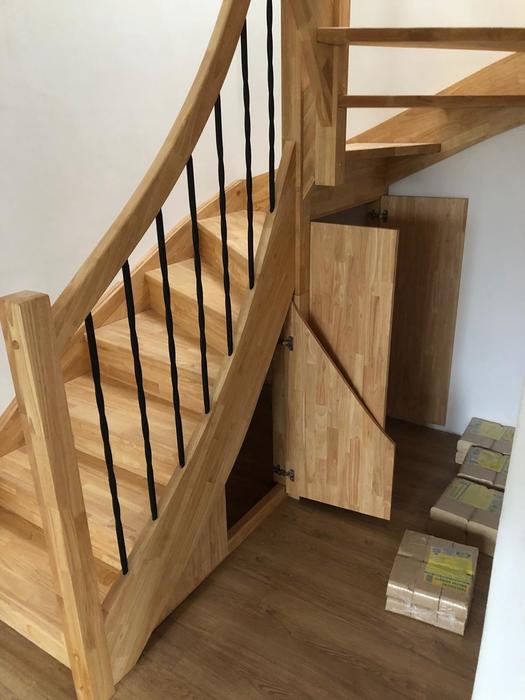 Úložný prostor pod schodištěm vznikl tak, že jsme ve spodní části schodiště vyrobili a namontovali schody s nášlapy i podstupni. Prostor pod schodištěm jsme uzavřeli dřevěnou stěnou se třemi dvířky, tak aby bylo možné se snadno dostat do celého úložního prostoru pod schodištěm.