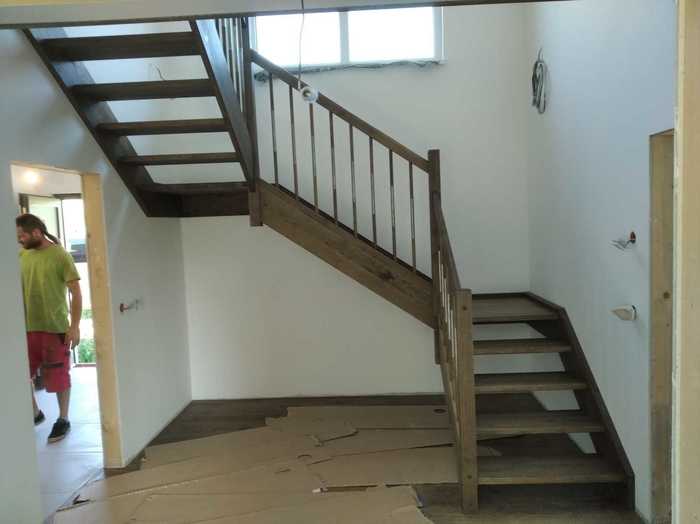 Samonosné schodiště jsme vyrobili a namontovali zákazníkovi od Kolína. Schodiště je samonosné, bez podstupňů a s podestami a galerií v patře. Jako materiál na výrobu schodiště jsme dle výběru zákazníka použili průběžný dub mořený do šeda a nerez na tyčky v zábradlí podél celého schodiště. Sloupky a madla na zábradlí na schodišti i galerii jsou také z mořeného průběžného dubu.