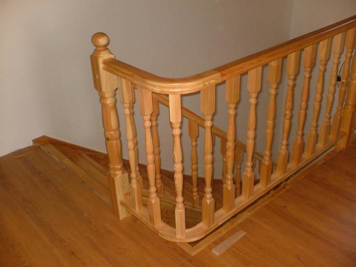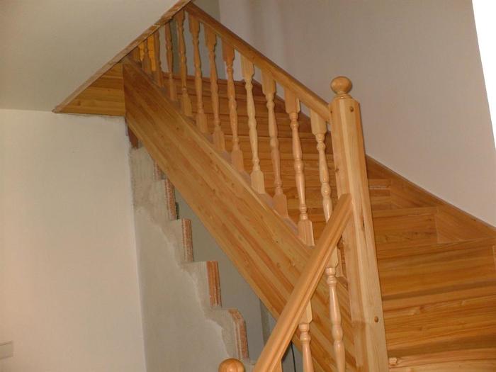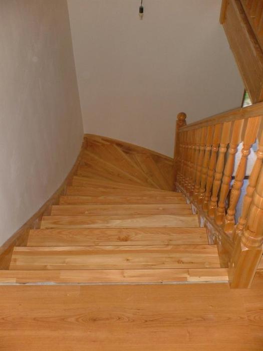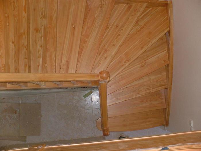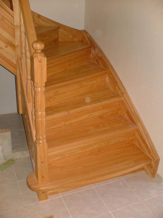 Tyto schody byli vyrobeny z dřeva modřínu a jsou určeny do patrového rodinného domu . Schody jsou ve tvaru „L“ s prvním zakulaceným nášlapem. Zábradlí tohoto schodiště je celodřevěné a také z masivu modřínu v provedení soustružených sloupků i tyček zábradlí. Horní část schodů byla vyrobena bez ochranné branky proti pádu dětí.